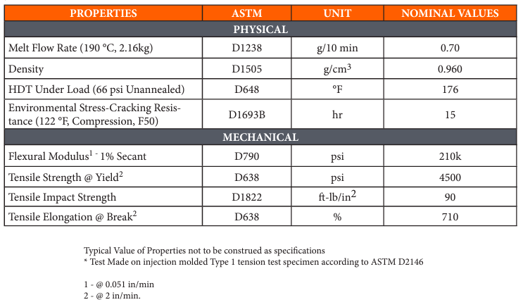 HD60-70 is a Phillips Process Blow Molding certified prime grade designed for containers for packaging of non-aggressive chemicals. HD60-70 features low to medium swell, easy processability in conventional continuous extrusion equipment, good ESCR, good Impact strength, high Stiffness, improved Barrier, and low Odor and Taste. HD60-70 processing temperature is 140 to 165°C., with mold 10 to 30°C. HD60-70 complies with FDA regulation 21CFR 177.520 (c) 3.1(a) + 3.2(a) and with most international regulations concerning the use of Polyethylene in contact with food articles.