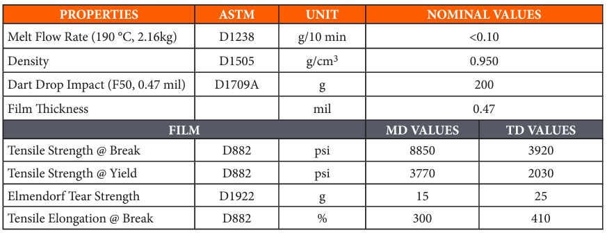 HW50-001 is a High Molecular Weight Hexene Copolymer certified prime resin developed for blown films. HW50-001 features UNIMODAL molecular weight distribution for improved processability at lower extruder pressure and good film stiffness. HW50-001 can be used alone or in BLENDS with LLDPE blown film grades and/or HMW-HDPE. HW50-001 can be used in a broad range of applications blended from 10% to 50% with either HMW-HDPE and/or LLDPE. HW50-001 can be processed on HMW, high stalk film equipment with a die gap >0.75 to 1.25< mm.. Recommended processing temperatures 195 to 205°C. HW50-001 complies with FDR regulation 21CFR 177.1520 (c) 3.1 (a) + 3.2 (a) and with most international regulations concerning the use of Polyethylene in contact with food articles.