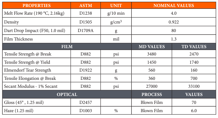 LD20-040 is a certified prime resin developed for EXTRUSION of good clarity Blown Film for packaging of articles requiring good opticals. LD20-040 features easy processability, and optimal balance of film strength, stiffness, good openability and excellent sealability. Maximum recommended film drawdown is 1.0 mil. LD20-040 contains medium slip and medium antiblock. LD20-040 complies with FDA regulation 21CFR 177.1520 (c) 2.2 and most international regulations concerning the use of Polyethylene in contact with food articles.