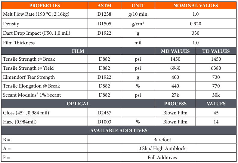 SureSpec LLC8-010 is a certified prime grade Ethylene-Octene Copolymer certified prime resin developed for production of High Performance Blown films of outstanding mechanical properties. LLC8-010 features easy processability and films exhibit very good Elmendorf Tear and include high toughness, impact strength and puncture resistance. Maximum recommended film drawdown is 0.4 mil. LLC8-010 contains no slip and no antiblock. LLC8-010 complies with FDA regulation 21CFR 177.1520 (c) 3.2(a) and most international regulations concerning the use of Polyethylene in contact with food articles.